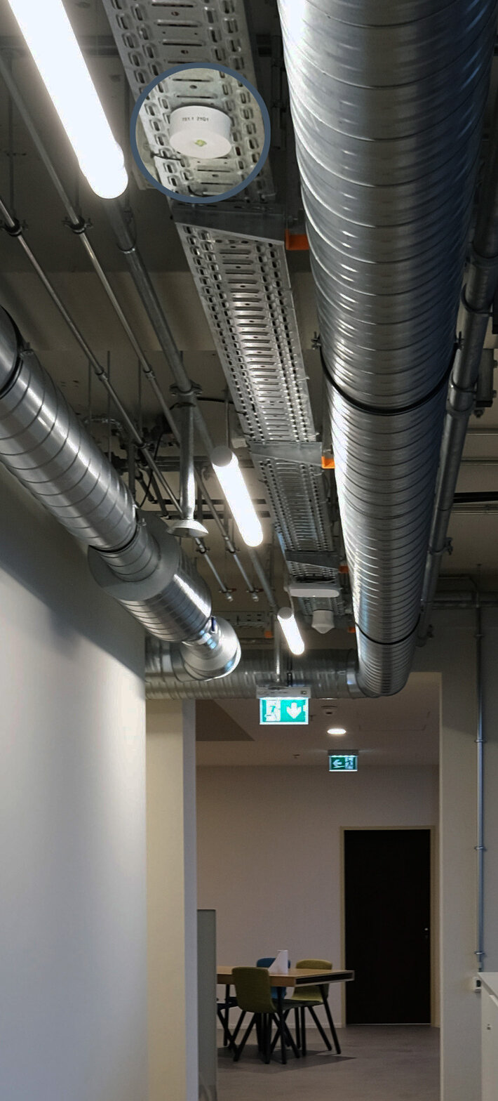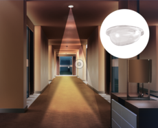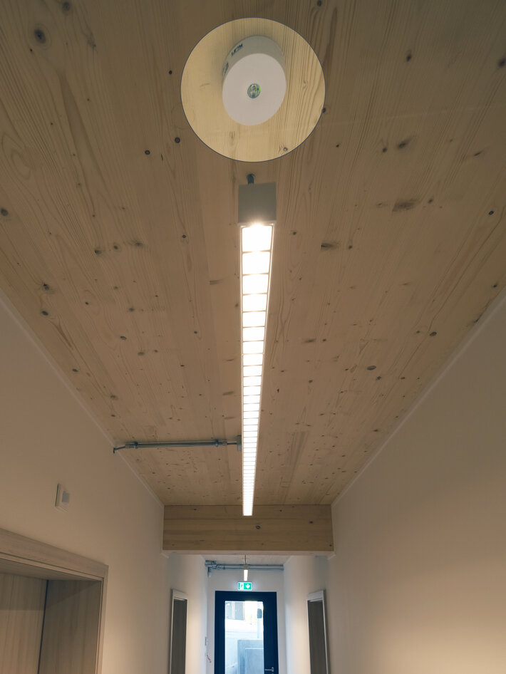 Dezente Kunststoff-Sicherheitsleuchte zum Deckenanbau *. Die runde Sicherheitsleuchte, die sich dem Design der Decke anpasst.