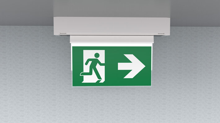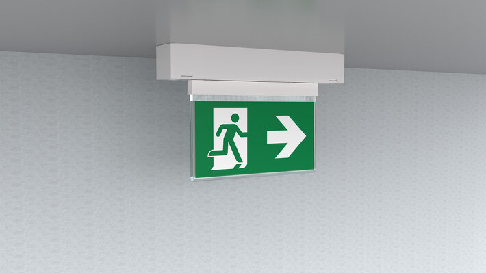 Steuerung und Überwachung über zentrales Stromversorgungssystem. Display-Scheibenleuchte mit integrierter Lichtverteilung zur gleichmäßgien Ausleuchtung des Piktogrammes. Geeignet zur ein- oder zweiseitigen Beschriftung. Planungssicherheit ist durch werkzeuglosen, variablen Einsatz der Piktogramme vor Ort gegeben. Ein Piktogrammset entsprechend DIN ISO 7010 (Pfeil rechts, links, oben und unten) ist standardmäßig im Lieferumfang enthalten. Die Universalmontage beinhaltet die Möglichkeit die Leuchte wahlweise als Wand- oder Deckenanbau zu montieren.