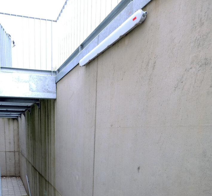 Die robuste LED-Wand- und Deckenleuchte aus glasfaserverstärktem Polyester für Feuchtraumanwendungen. Die externen Befestigungsbügel erleichtern die Montage.
