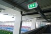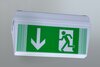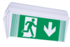 Trapezförmige Kunststoff-Rettungszeichenleuchte zum Deckenanbau für ein- oder beidseitige Beschriftung mit selbstklebendem Piktogramm.