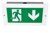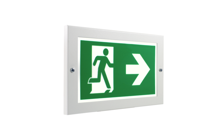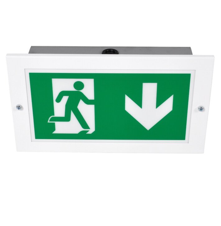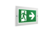 In die Wand integrierte Rettungszeichenleuchte aus Metall.