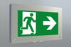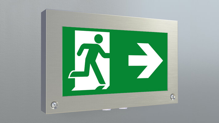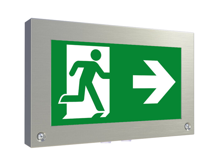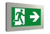Hochwertige vandalensichere Edelstahl Rettungszeichenleuchte zur Kennzeichnung der Flucht- und Rettungswege mit montage- und servicefreundlichem Scharniermechanismus.