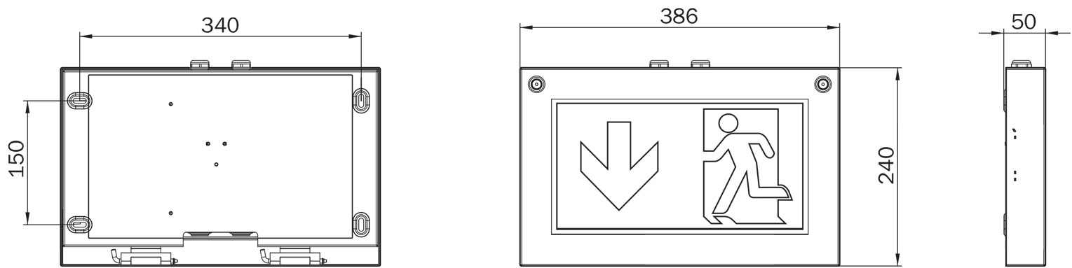 Automatische Überwachung der Sicherheitsleuchte mit SelfControl. Planungssicherheit ist durch werkzeuglosen, variablen Einsatz der Piktogramme vor Ort gegeben. Die Piktogramme entsprechend DIN ISO 7010 (Pfeil rechts, links, unten und oben) sind standardmäßig im Lieferumfang enthalten. Auf Anfrage kann die Beschriftung auch nach Kundenvorgabe erfolgen.