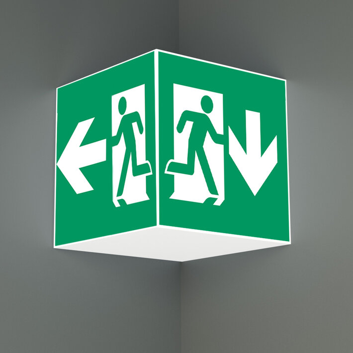 Durch die Würfelform ist diese Leuchte von vier Seiten gut erkennbar. Ideal für Anwendungen bei Wegkreuzungen, wie z.B. in Kaufhäusern mit Regalgängen.