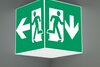 Quadratische Rettungszeichen-Würfelleuchte zur Kennzeichnung der Flucht- und Rettungswege. Sie kann direkt an die Decke montiert oder mit entsprechendem Zubehör abgehängt werden.