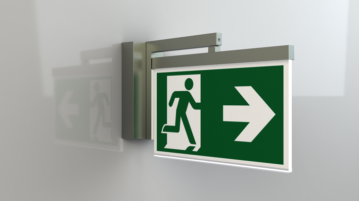 Modern zinc die-cast emergency exit sign luminaire for surface mounting on the wall. Thanks to the wall bracket, the escape and emergency routes are identified at right angles to the wall. This can be done on either one or two sides.