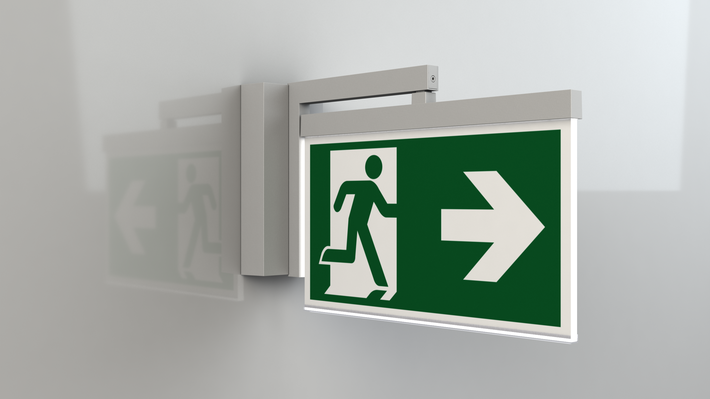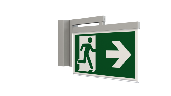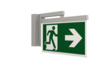 Modern zinc die-cast emergency exit sign luminaire for surface mounting on the wall. Thanks to the wall bracket, the escape and emergency routes are identified at right angles to the wall. This can be done on either one or two sides.
