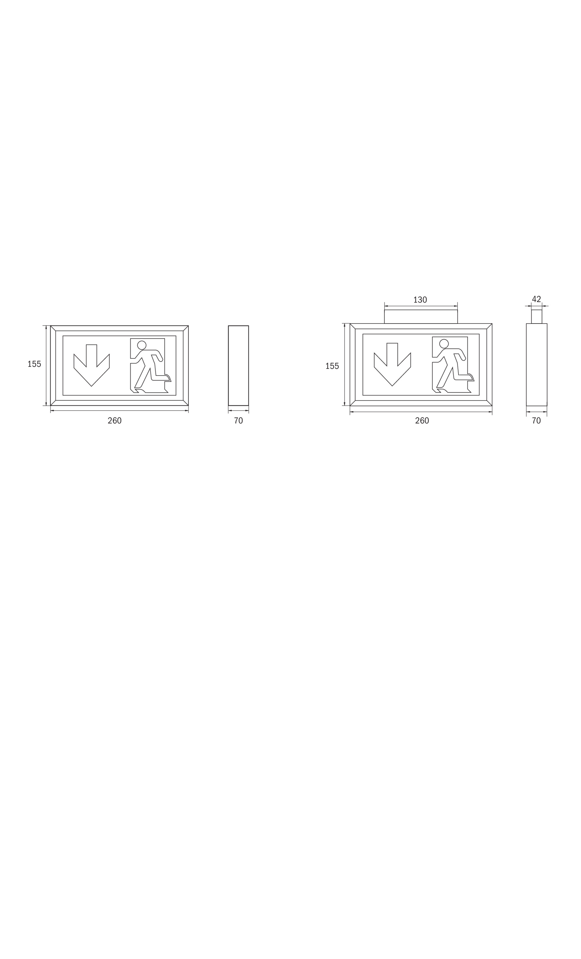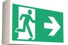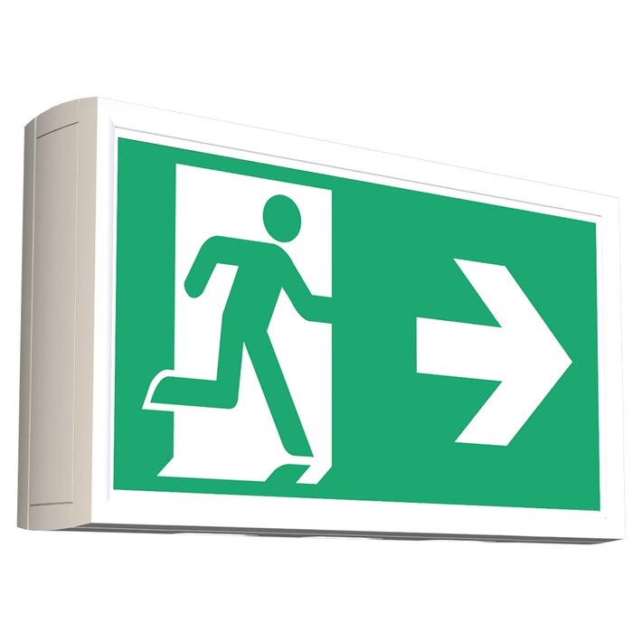 Box-shaped plastic emergency exit sign luminaire for universal mounting. Suited to inscription on one or two sides.