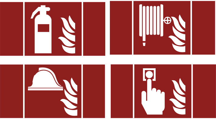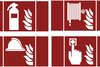 The set comprises of two pictograms each for identifying: fire extinguisher, fire hose, fire alarm, firefighting equipment