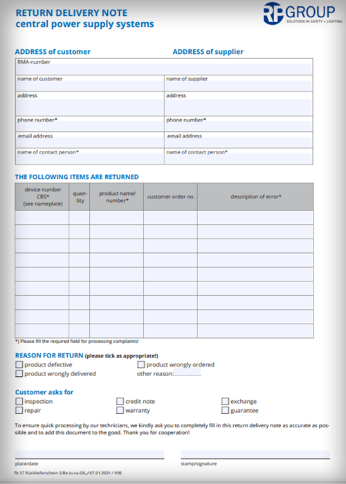Formulaire de retour pour les luminaires de secours (anglais)