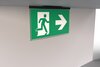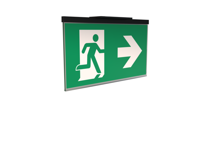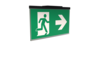 Luminaire moderne à pictogramme de secours en zinc moulé sous pression pour montage encastré au plafond. La signalisation des issues de secours et des voies d’évacuation s’effectue au choix sur une face ou sur les deux faces.