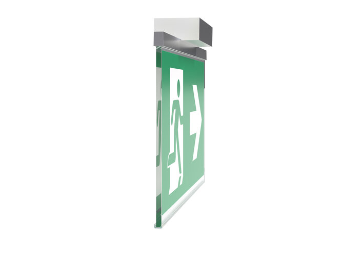 Luminaire moderne à pictogramme de secours en zinc moulé sous pression pour montage en saillie au plafond. La signalisation des issues de secours et des voies d’évacuation s’effectue au choix sur une face ou sur les deux faces.