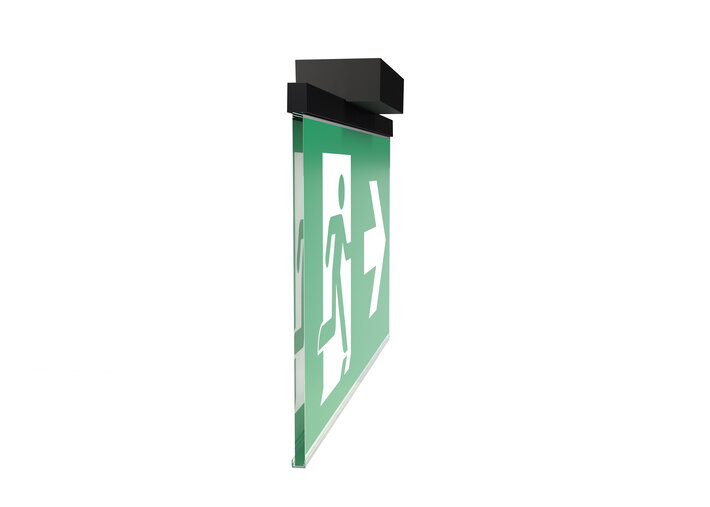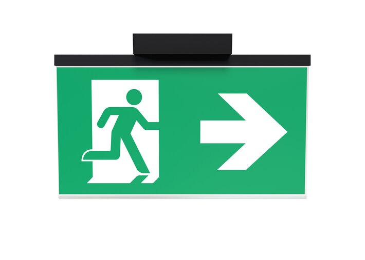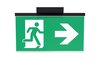 Luminaire moderne à pictogramme de secours en zinc moulé sous pression pour montage en saillie au plafond. La signalisation des issues de secours et des voies d’évacuation s’effectue au choix sur une face ou sur les deux faces.