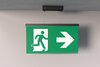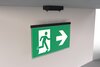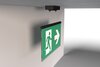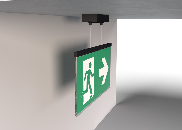 Luminaire moderne à pictogramme de secours en zinc moulé sous pression avec suspension par câble pour montage en saillie au plafond. La signalisation des issues de secours et des voies d’évacuation s’effectue au choix sur une face ou sur les deux faces.