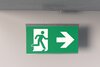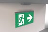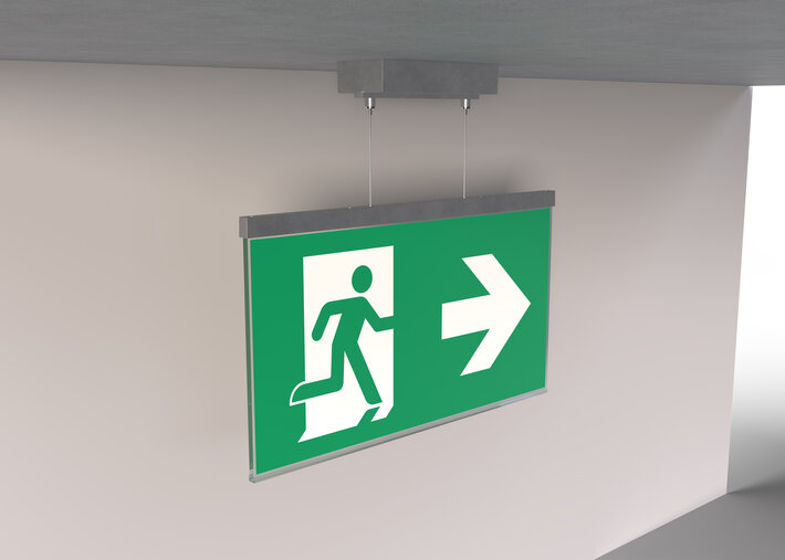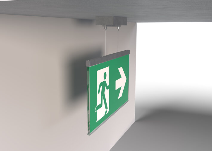Luminaire moderne à pictogramme de secours en zinc moulé sous pression avec suspension par câble pour montage en saillie au plafond. La signalisation des issues de secours et des voies d’évacuation s’effectue au choix sur une face ou sur les deux faces.