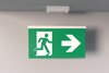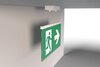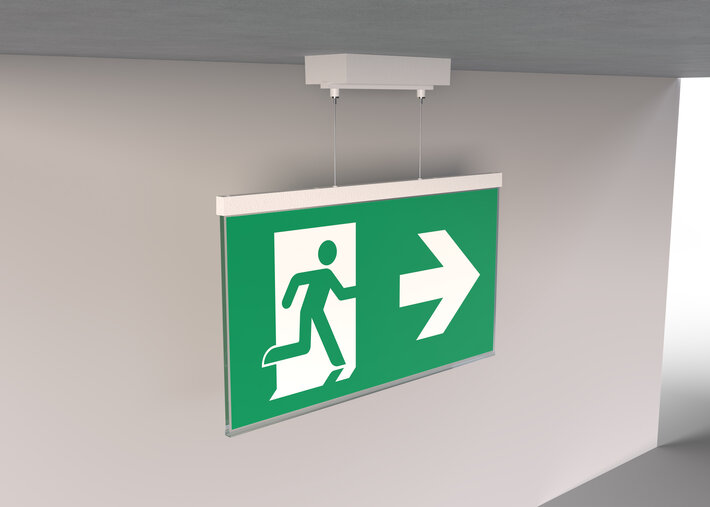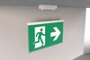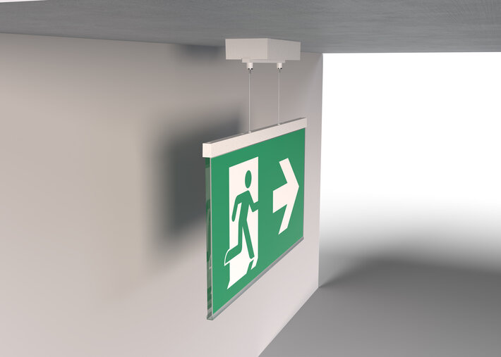 Luminaire moderne à pictogramme de secours en zinc moulé sous pression avec suspension par câble pour montage en saillie au plafond. La signalisation des issues de secours et des voies d’évacuation s’effectue au choix sur une face ou sur les deux faces.