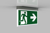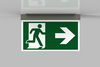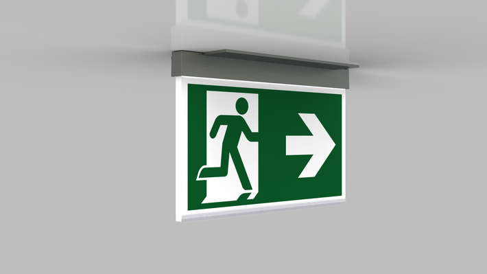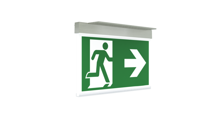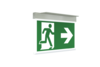 Luminaire moderne à pictogramme de secours en zinc moulé sous pression pour montage encastré au plafond. La signalisation des issues de secours et des voies d’évacuation s’effectue au choix sur une face ou sur les deux faces.