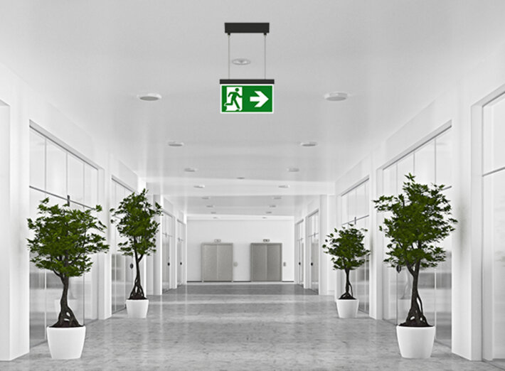 Surveillance automatique de la lampe de sécurité avec SelfControl. Impossible de se tromper lors de la planification grâce aux pictogrammes logiques imprimés. Les pictogrammes conformes à la norme DIN ISO 7010 (flèches à droite, à gauche et en bas) sont contenus dans la livraison standard. L’impression peut également être faite sur demande en fonction des prescriptions du client.