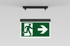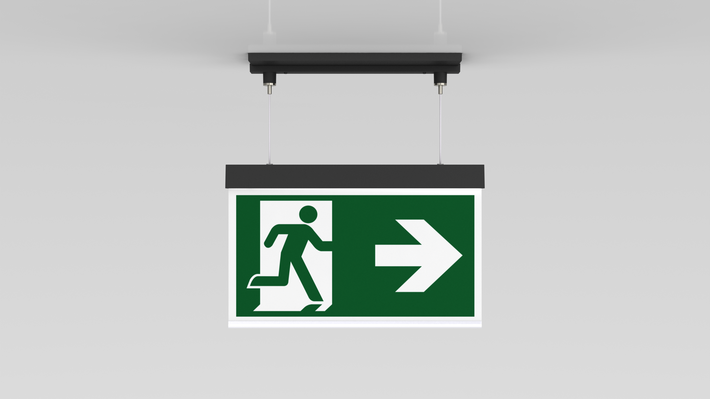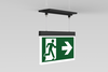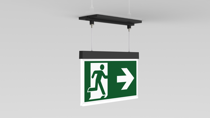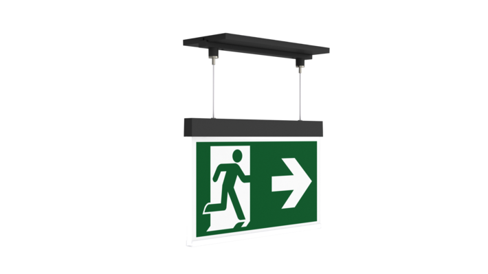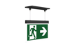 Luminaire moderne à pictogramme de secours en zinc moulé sous pression avec suspension par câble pour montage encastré au plafond. La signalisation des issues de secours et des voies d’évacuation s’effectue au choix sur une face ou sur les deux faces.