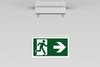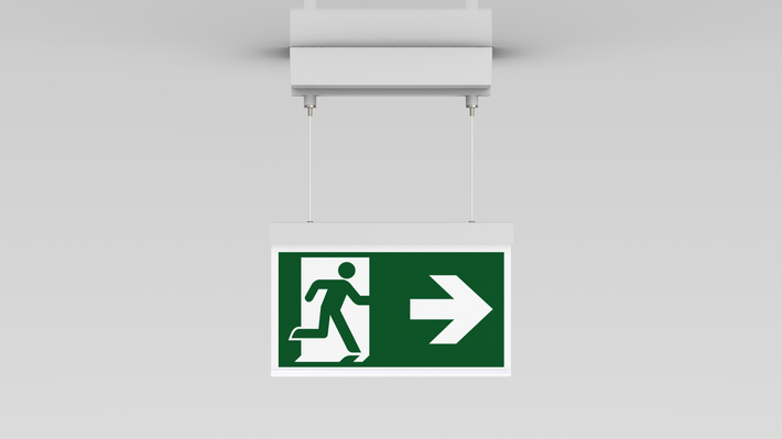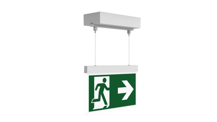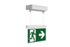 Luminaire moderne à pictogramme de secours en zinc moulé sous pression avec suspension par câble pour montage en saillie au plafond. La signalisation des issues de secours et des voies d’évacuation s’effectue au choix sur une face ou sur les deux faces.