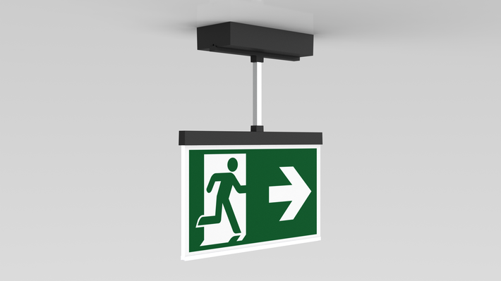 Luminaire moderne à pictogramme de secours en zinc moulé sous pression avec suspension pour montage en saillie au plafond. La signalisation des issues de secours et des voies d’évacuation s’effectue au choix sur une face ou sur les deux faces.