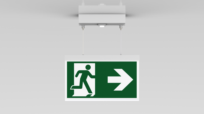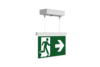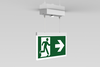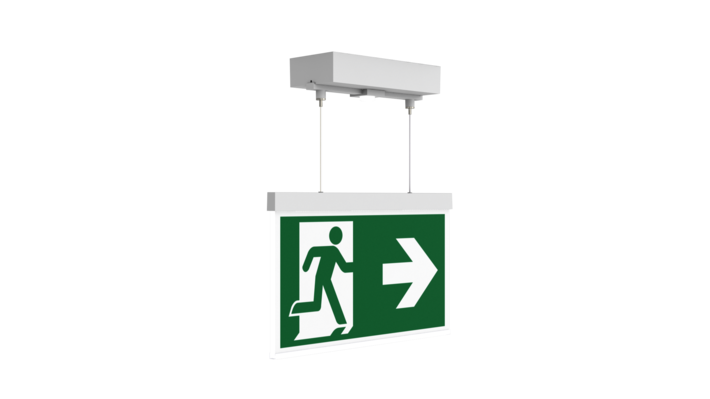 Luminaire moderne à pictogramme de secours/de sécurité en zinc moulé sous pression avec suspension par câble pour montage en saillie au plafond. La signalisation des issues de secours et des voies d’évacuation s’effectue au choix sur une face ou sur les deux faces. La technologie Duo assure, à l’aide d’une LED supplémentaire, la signalisation lumineuse des voies d’évacuation et des issues de secours en cas de panne de courant.