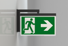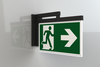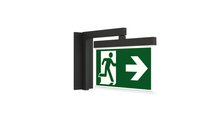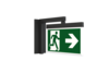 Luminaire moderne à pictogramme de secours en zinc moulé sous pression pour montage mural encastré. La signalisation des issues de secours et des voies d’évacuation s’effectue en angle droit par rapport au mur grâce au support mural, au choix sur une face ou sur les deux faces.