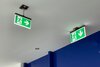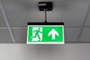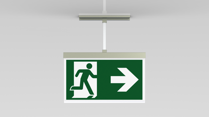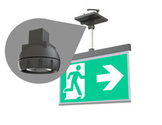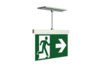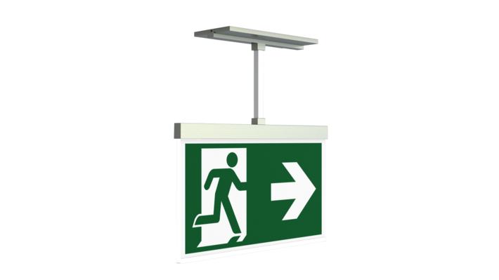 Luminaire moderne à pictogramme de secours en zinc moulé sous pression avec suspension pour montage encastré au plafond. La signalisation des issues de secours et des voies d’évacuation s’effectue au choix sur une face ou sur les deux faces.