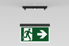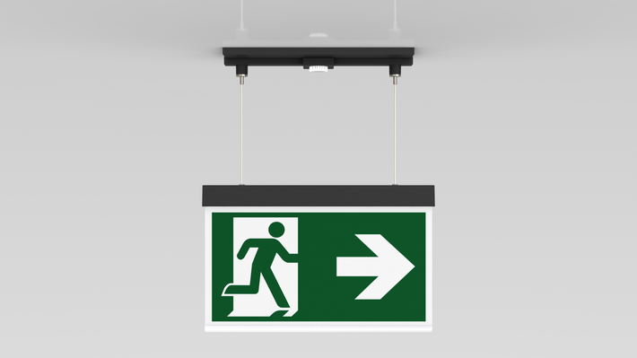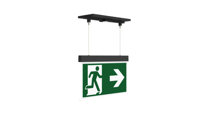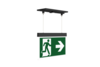 Luminaire moderne à pictogramme de secours/de sécurité en zinc moulé sous pression avec suspension par câble pour montage encastré au plafond. La signalisation des issues de secours et des voies d’évacuation s’effectue au choix sur une face ou sur les deux faces. La technologie Duo assure, à l’aide d’une LED supplémentaire, la signalisation lumineuse des voies d’évacuation et des issues de secours en cas de panne de courant.