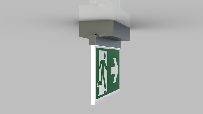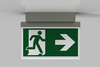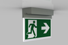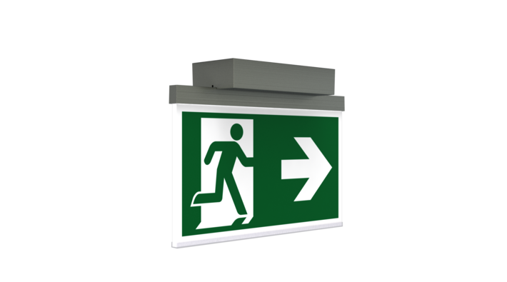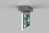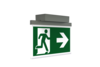Luminaire moderne à pictogramme de secours en zinc moulé sous pression pour montage en saillie au plafond. La signalisation des issues de secours et des voies d’évacuation s’effectue au choix sur une face ou sur les deux faces.