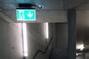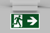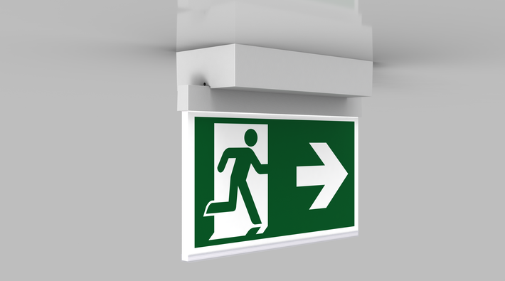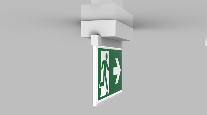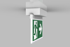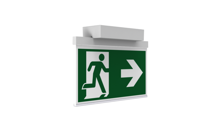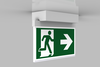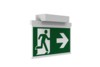 Luminaire moderne à pictogramme de secours en zinc moulé sous pression pour montage en saillie au plafond. La signalisation des issues de secours et des voies d’évacuation s’effectue au choix sur une face ou sur les deux faces.