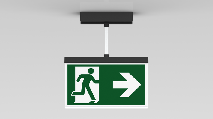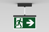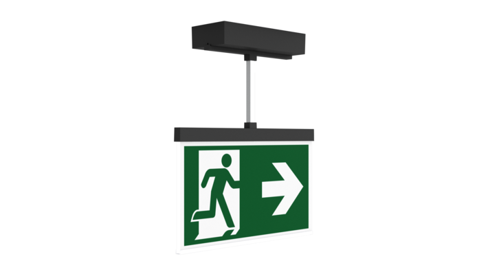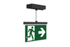 Luminaire moderne à pictogramme de secours en zinc moulé sous pression avec suspension pour montage en saillie au plafond. La signalisation des issues de secours et des voies d’évacuation s’effectue au choix sur une face ou sur les deux faces.