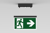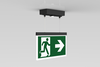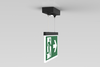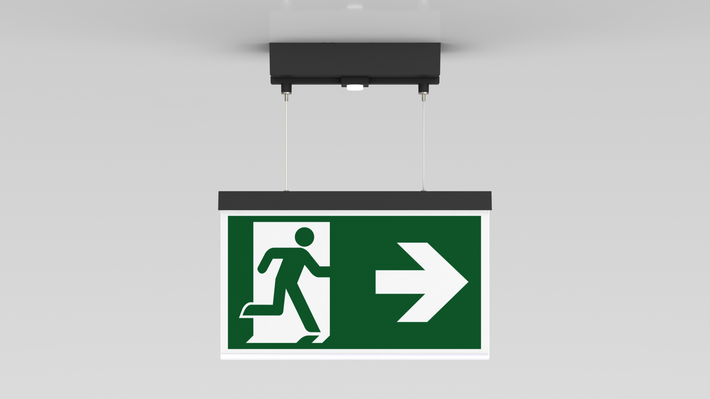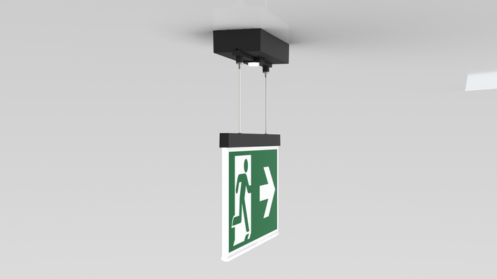 Luminaire moderne à pictogramme de secours/de sécurité en zinc moulé sous pression avec suspension par câble pour montage en saillie au plafond. La signalisation des issues de secours et des voies d’évacuation s’effectue au choix sur une face ou sur les deux faces. La technologie Duo assure, à l’aide d’une LED supplémentaire, la signalisation lumineuse des voies d’évacuation et des issues de secours en cas de panne de courant.