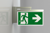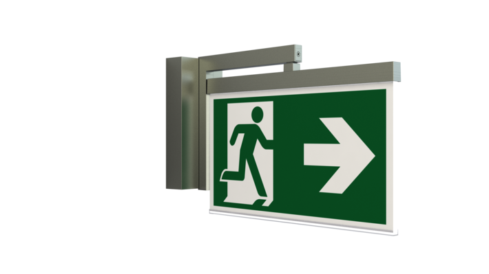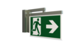 Luminaire moderne à pictogramme de secours en zinc moulé sous pression pour montage mural en saillie. La signalisation des issues de secours et des voies d’évacuation s’effectue en angle droit par rapport au mur grâce au support mural, au choix sur une face ou sur les deux faces.