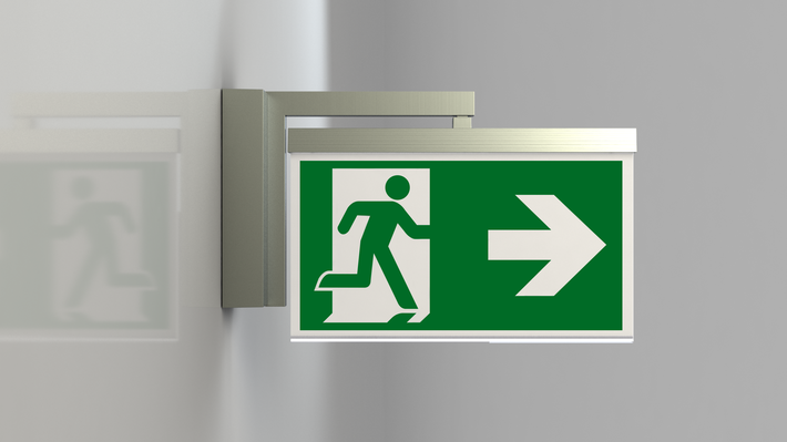 Surveillance automatique de la lampe de sécurité avec SelfControl. Impossible de se tromper lors de la planification grâce aux pictogrammes logiques imprimés. Les pictogrammes conformes à la norme DIN ISO 7010 (flèches à droite, à gauche et en bas) sont contenus dans la livraison standard. L’impression peut également être faite sur demande en fonction des prescriptions du client.