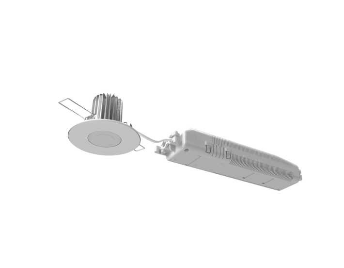 La structure, ainsi que le matériau utilisé, assurent une bonne dissipation de la chaleur et une longue durée de vie de la LED. La forme de construction compacte permet un montage dans une découpe au plafond de 68 mm. La fixation se fait aisément à l’aide de ressorts de serrage.