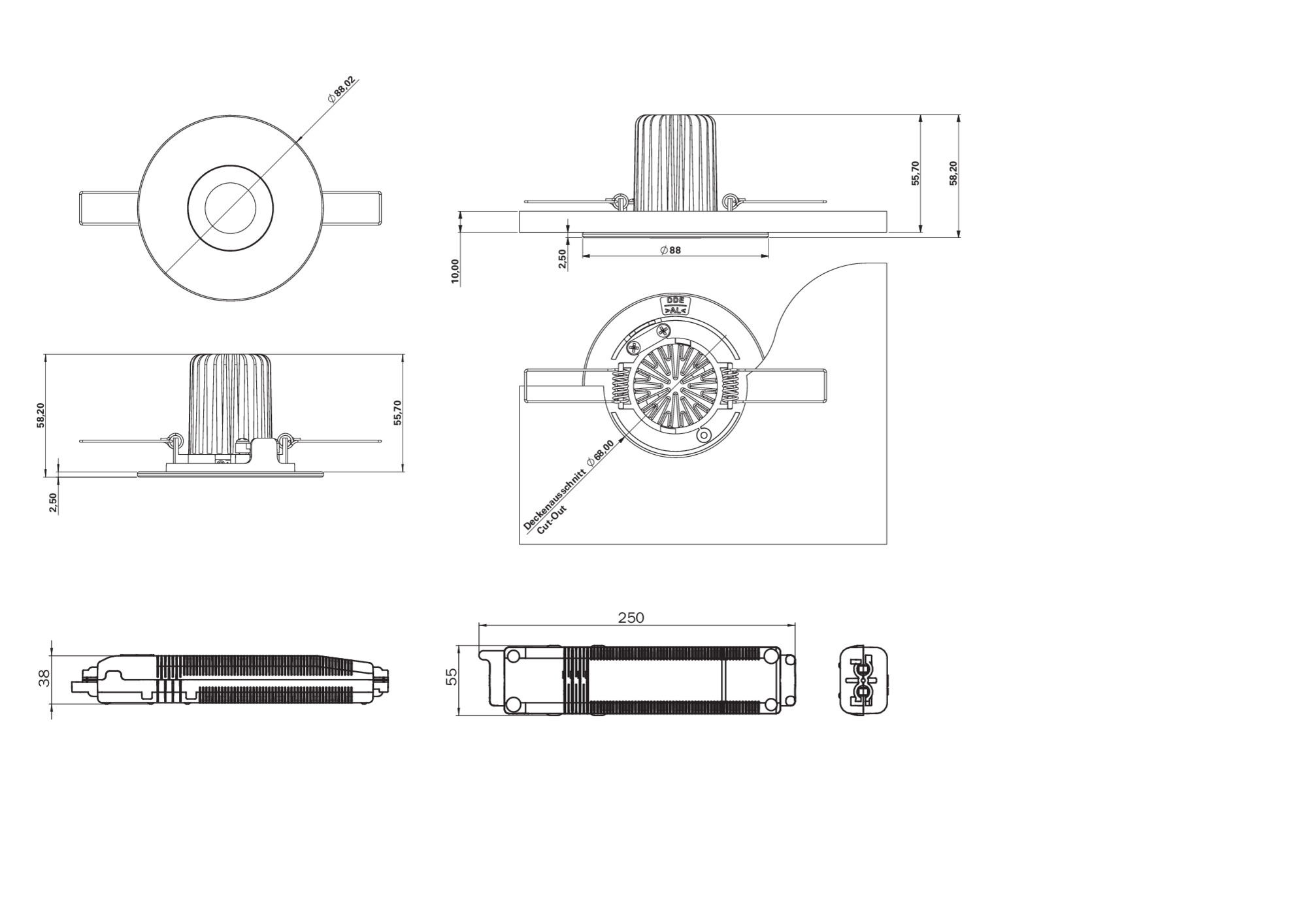 La structure, ainsi que le matériau utilisé, assurent une bonne dissipation de la chaleur et une longue durée de vie de la LED. La forme de construction compacte permet un montage dans une découpe au plafond de 68 mm. La fixation se fait aisément à l’aide de ressorts de serrage.