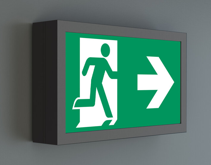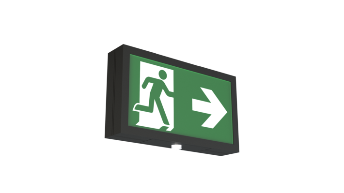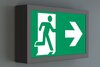 Surveillance automatique de la lampe de sécurité avec SelfControl. Impossible de se tromper lors de la planification grâce aux pictogrammes logiques imprimés. Les pictogrammes conformes à la norme DIN ISO 7010 (flèches à droite, à gauche et en bas) sont contenus dans la livraison standard. L’impression peut également être faite sur demande en fonction des prescriptions du client.
