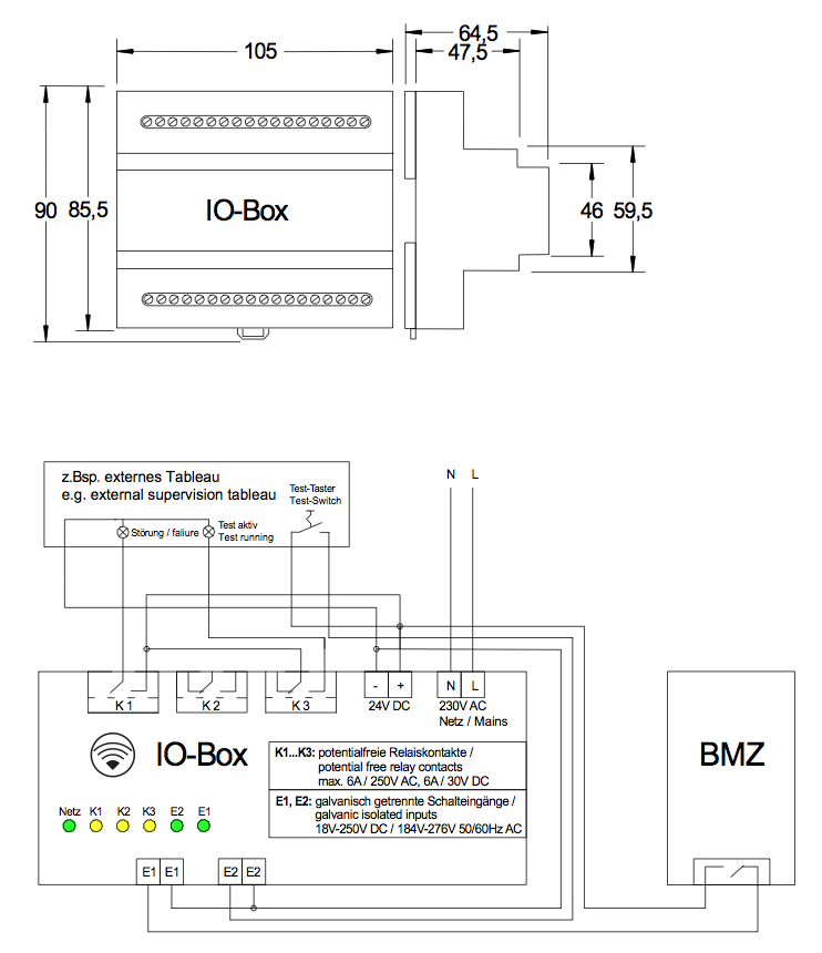 La boîte IO WLIO32 est un module d'interface permettant de transmettre des signaux externes, tels que des commandes de commutation, à la WL, ainsi que de signaler les états de fonctionnement. La boîte IO dispose de 3 sorties sous forme de contacts inverseurs sans potentiel, dont le contact K1 est utilisé pour signaler le défaut collectif. Les deux autres contacts, K2 et K3, peuvent être librement programmés à l'aide du logiciel Wireless Professional. Chaque relais de sortie est associé à une LED qui indique si un relais est activé.