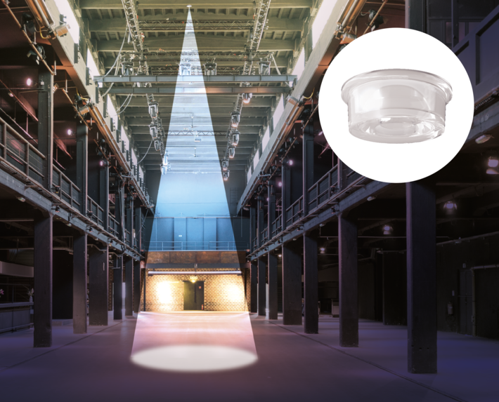 Spotlinsen sørger for en jevn lysfordeling i alle retninger. Egnet for takhøyder godt over 4 meter, for eksempel i et produksjonsanlegg. Kan også brukes til åpne områder på hotell (brotid 8 timer).